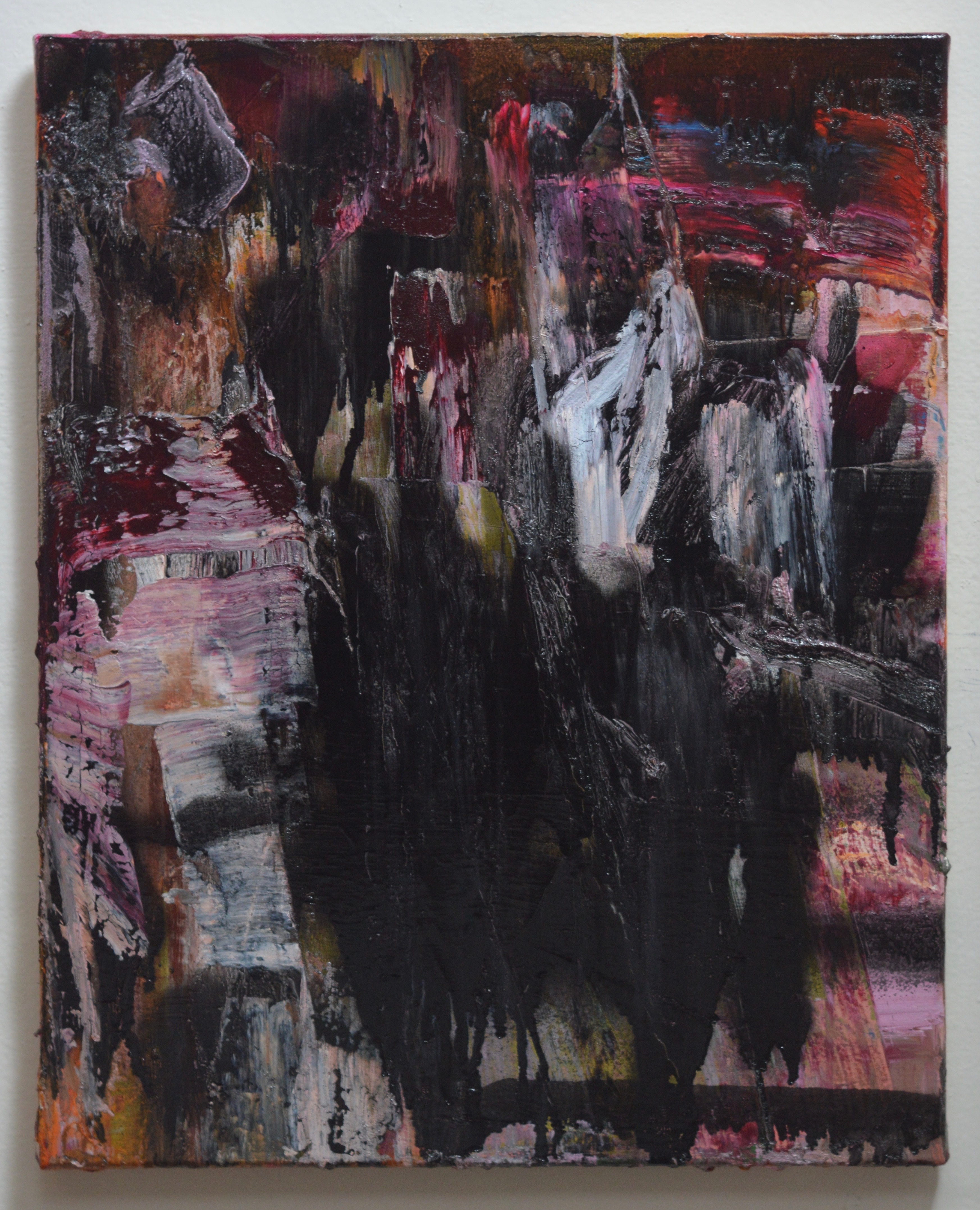 oil, enamel, polyurethane, oil based marker, spray foam, silicone caulking, parafin, staples, suede cord, and fabric on canvas mounted on board